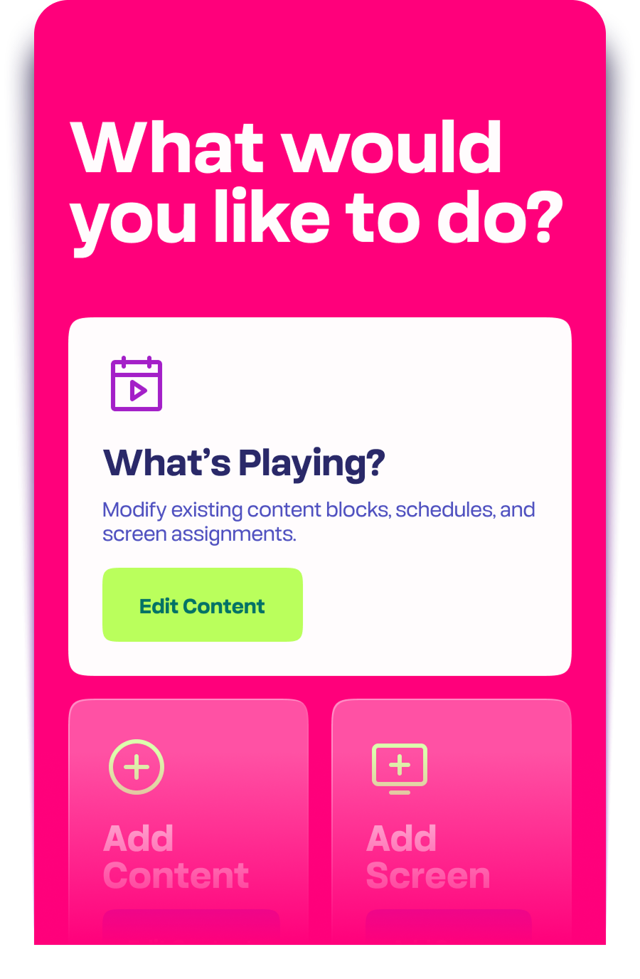 Broadcast your message across your network of screens or target specific locations. Enable kiosk mode for interactive touchscreen experiences without rebuilding your apps.