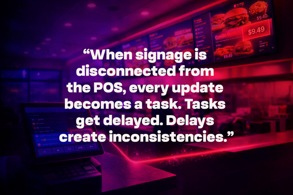 Dynamic menu platforms connected through POS integrated digital menu boards ensure that pricing, inventory, and promotional logic remain aligned across all stores.